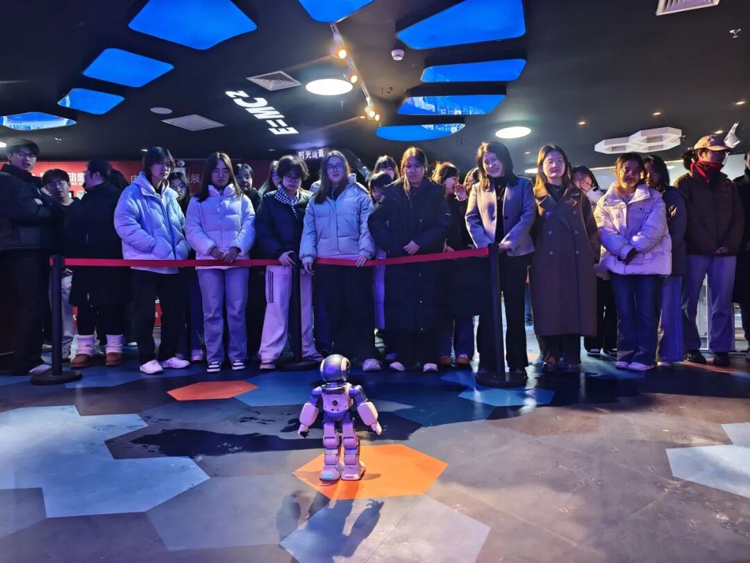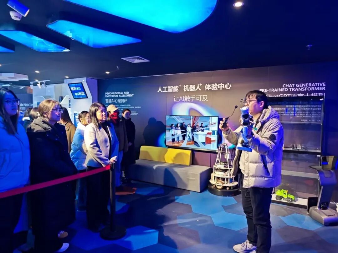 在专业讲解员的带领下,师生们从AI基地标志牌出发,踏上探索之旅:听讲解梳理基地前世今生、解读企业文化,建立对AI产业的宏观认知;随后走进5D影院,在沉浸式视听体验中让知识具象化,深化对智能科技的理解与向往。